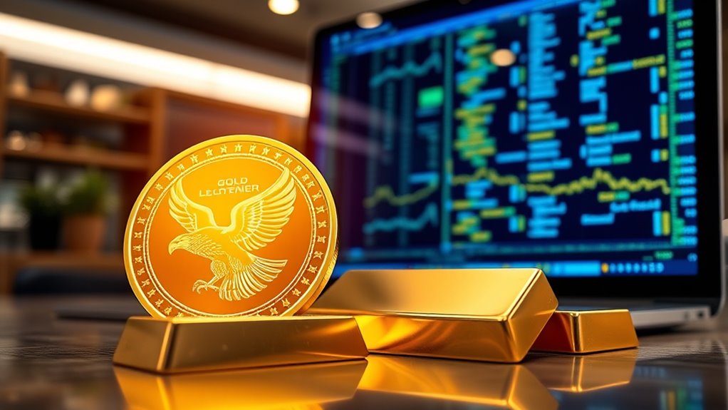 Gold-backed cryptocurrencies combine the stability of owning real gold with the convenience of blockchain technology. They allow you to invest, transfer, and trade physical gold digitally, offering transparency and security through regular audits and blockchain traceability. Supported by major platforms, these tokens make gold accessible globally while reducing expenses linked to storage and security. If you want to understand how this innovative fusion of tradition and tech can enhance your portfolio, there’s more to explore ahead.