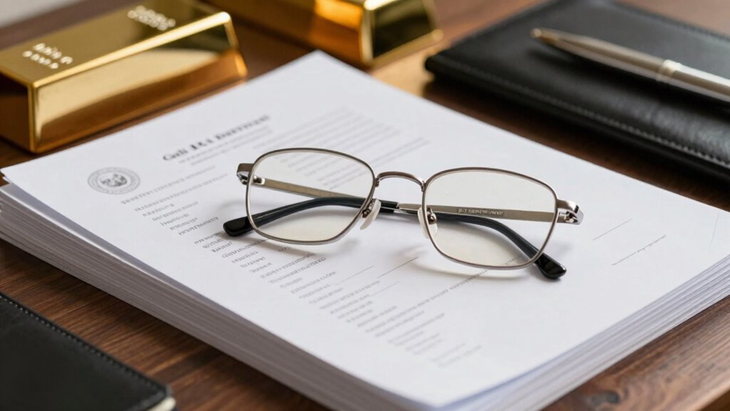 Ironically, even though you’re responsible for your Gold IRA paperwork, many neglect to keep proper records. You should actively manage paper storage and digital backups to guarantee everything’s safe and accessible. Keep copies of all transaction records, statements, and legal documents. While your custodian maintains the original paperwork, it’s up to you to verify its safety, organize backups, and preserve the paper trail—because losing essential documents can be costly.