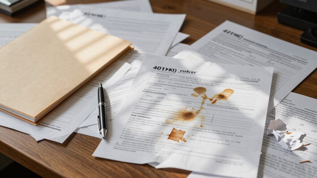 Failing to organize and secure your old 401(k) rollover forms can cause big problems later, like delays, errors on tax returns, or difficulty verifying account details. Without a proper filing system, you risk losing important documents or exposing sensitive information. Taking the time to organize, label, and protect these forms now helps guarantee smooth future reviews and retirement planning. Keep going to discover key tips that can save you from costly mistakes down the line.