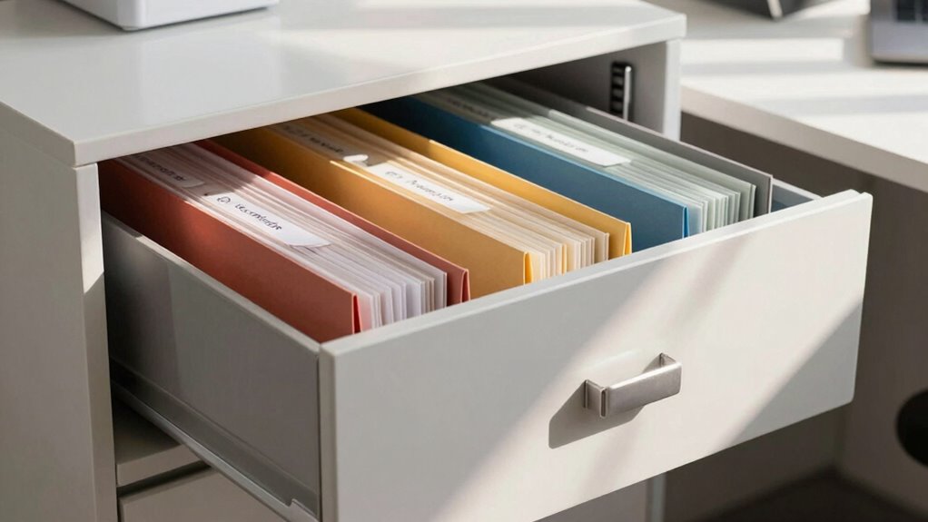 Once your digital files are organized, focus on physical file drawer organization. Color coding is a powerful visual tool that can help you instantly identify categories or priority levels. Assign specific colors to different types of documents—blue for financial records, red for urgent client requests, green for project proposals, and so on. When you glance at your drawer, the color scheme allows you to locate what you need at a glance, reducing the time spent searching. Be consistent with your color assignments, and ensure everyone who accesses the files understands the system. This consistency prevents confusion and guarantees that everyone can quickly find and return items to their correct place.