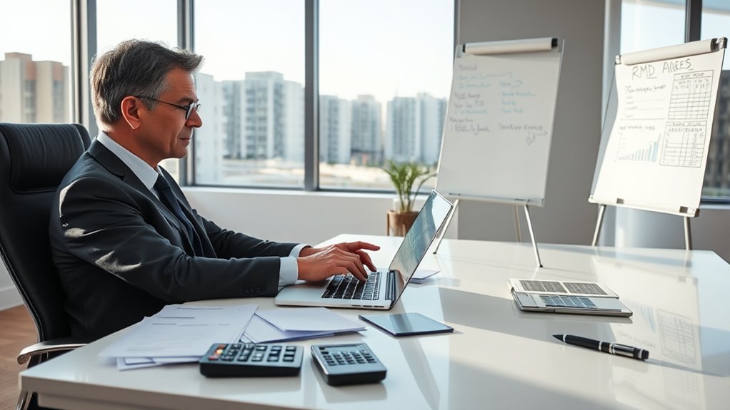 Finally, managing withholding and understanding your tax situation during RMDs is vital. You can opt for 100% withholding on your RMDs, which simplifies tax payments and reduces surprises at tax time. Proper withholding treats your RMDs as paid taxes for the year, easing cash flow and helping you avoid underpayment penalties. Tailoring withholding rates to your state and federal requirements and monitoring changes in tax laws ensures you stay within your tax brackets and avoid increased Medicare premiums. Additionally, when you have multiple retirement accounts, RMD calculations must be performed separately for each account, but you can often aggregate withdrawals from IRAs and 403(b)s to meet your RMD obligations efficiently, maximizing your tax planning strategies.