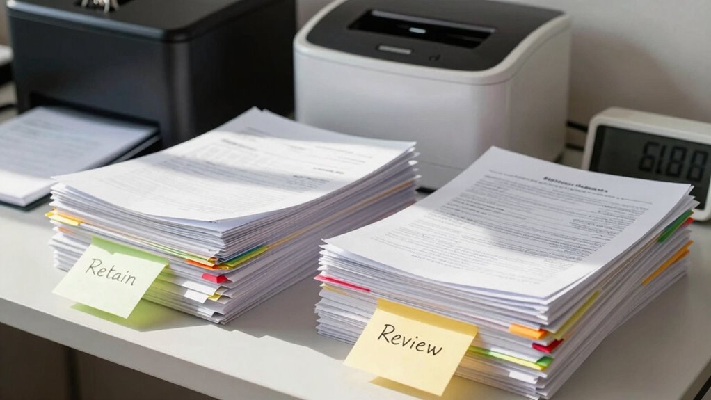 Implementing a disciplined schedule helps you stay compliant and reduces clutter. For instance, you might set a monthly or quarterly review to go through your files, identify documents that have reached their retention limit, and securely dispose of them. This process not only optimizes your storage space but also guarantees that you’re practicing responsible data disposal. Shredding documents containing personal information, such as Social Security numbers, bank details, or medical records, is essential to prevent misuse.