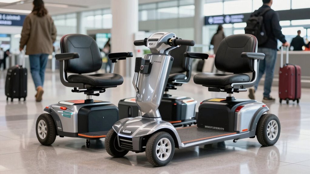 Mobility scooters approved for airline travel typically weigh between 36 and 50 pounds, making them manageable to carry and transport. Foldable designs greatly enhance portability, allowing the scooter to collapse into compact sizes that fit easily in overhead compartments or car trunks. Lightweight materials like aluminum alloy are commonly used to keep the weight down without sacrificing durability or strength. Removable batteries are also a key feature, as they let you carry spare batteries separately and simplify charging. The total weight, including batteries, determines whether you can carry the scooter onto a plane without extra fees or special arrangements. Overall, a lightweight, foldable design ensures easier handling, whether you’re lifting it into a vehicle or steering through busy airport terminals.