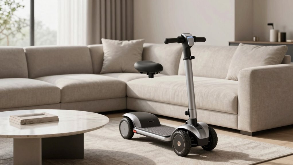 Since space is often limited in apartments, I look for a mobility scooter with a lightweight folding mechanism that’s quick and easy to use. Ideally, it folds in just one or two steps, so I can set it up or store it in seconds without hassle. A quick folding process, taking less than 10 seconds, makes spontaneous use convenient. The compact design lets me fit the scooter into small spaces like closets, car trunks, or under tables, which is essential for apartment living. An ergonomic folding system minimizes effort, especially important if I have limited strength or mobility. Plus, I prefer a foldable scooter that maintains stability and safety once folded, ensuring that handling during transport remains secure and confident.