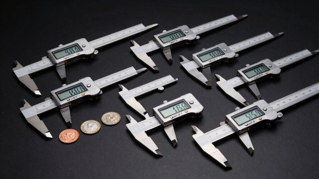 Ever wonder how digital calipers handle temperature swings? They’re pretty smart, actually. Most have built-in sensors that compensate for temperature variations, maintaining accuracy even when it’s hot or cold. I’ve found that using calipers within their recommended temperature range helps guarantee precise measurements. So, whether you’re in a chilly workshop or a sunny yard, these calipers adapt, keeping your coin measurements reliable and consistent—like a trusted friend in any weather.