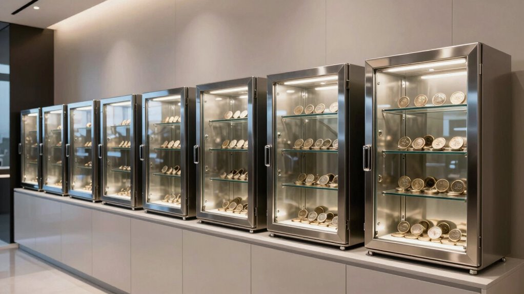 Think of your coin collection as a treasure chest guarded by a vigilant dragon. Choosing the right display safe is like forging a mighty shield—protecting your prized possessions from harm. With the right choice, your showroom becomes a fortress of elegance and security, where every coin shines like a rare jewel. So, pick wisely and let your collection’s story be one of beauty and protection, standing tall through time’s endless march.