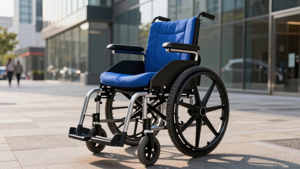 A comfortable seat cushion is vital for guaranteeing a smooth and enjoyable ride on an electric wheelchair with shock absorption. I look for cushions made of high-density foam that are thick and breathable, which helps reduce pressure points during long periods of sitting. Memory foam or gel-infused cushions can provide extra shock absorption and help regulate temperature for added comfort. Ergonomic contouring is essential since it maintains proper spinal alignment and evenly distributes weight, preventing fatigue. I also prefer cushions that are removable and washable, making maintenance simple and ensuring hygiene. Additionally, cushions made with shock-absorbing materials help diminish vibrations from uneven terrain, greatly improving ride quality. Prioritizing these factors guarantees comfort, support, and a smoother experience on any journey.