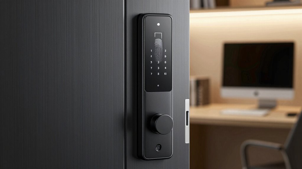 Choosing a fingerprint door lock with versatile access methods guarantees you can customize security to suit your home office needs. Supporting multiple unlocking options like fingerprint, keypad, app control, and mechanical key provides maximum flexibility for different situations. I prefer locks that can store many user profiles—up to 100 fingerprints or passwords—so family, staff, or guests can gain easy access without hassle. Quick biometric sensors, recognizing fingerprints in just 0.3 to 0.5 seconds, make entry seamless and efficient. Compatibility with temporary codes or remote app management allows me to tailor security and grant access remotely. Plus, a multi-method system with backup options, such as mechanical keys or emergency charging, guarantees I stay protected even during power or technical failures.