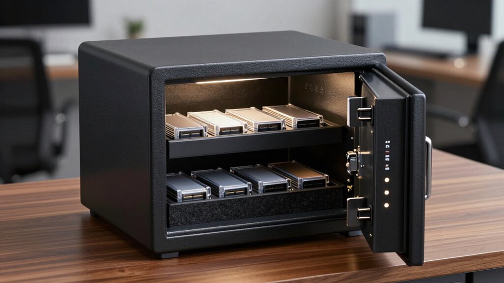 Ever wondered how to guarantee your SSDs and USB drives stay safe during a fire? The key is choosing a safe with the right fire resistance level. Look for UL or ETL certification, which confirms the safe can withstand temperatures of at least 1550°F for 30 minutes or more. A documented fire resistance rating indicates how long and at what temperature the safe can endure, giving you confidence in its protective capabilities. It’s essential to select a safe tested against extreme conditions, including rapid temperature changes, to ensure your data remains intact. Fireproof materials and insulation are critical—they prevent internal temperatures from rising too high. Always verify that the fire resistance level matches the maximum temperature and duration your storage media might face in a typical fire.