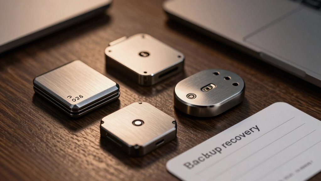 Backup methods are essential for ensuring you can recover your assets if your hardware wallet gets lost or damaged. Many wallets offer options like microSD cards, seed phrases, or metal seed storage capsules. MicroSD backups provide quick recovery, use open-source firmware, and are compatible with multiple wallet types, offering flexibility. Metal seed storage capsules or steel plates protect your seed phrases from environmental damage, theft, and tampering, ensuring long-term security. Some options avoid paper seed phrases altogether, using durable, fireproof, and corrosion-resistant materials. The choice of backup method depends on balancing ease of use with physical security. As a beginner, selecting a method that’s simple yet resistant to damage is key to safeguarding your crypto assets effectively.