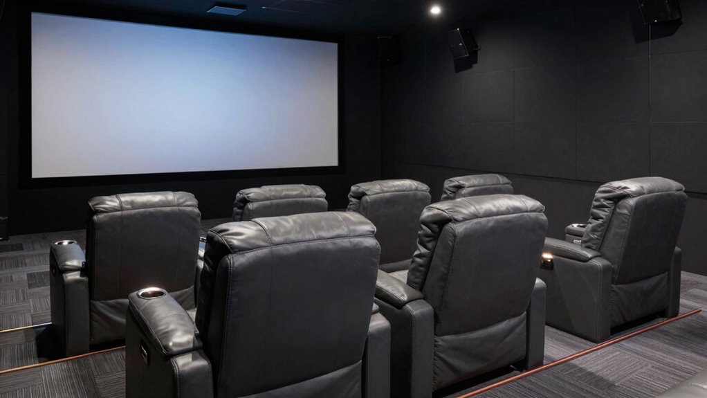 You might think recliner rows are just about comfort, but surprisingly, they also shape room acoustics. I’ve found that the placement and fabric of these rows can absorb or reflect sound, influencing how clear dialogue and effects come through. It’s like an unexpected sound engineer’s secret; smart arrangement minimizes echo and enhances audio quality, making your home theater experience truly immersive.