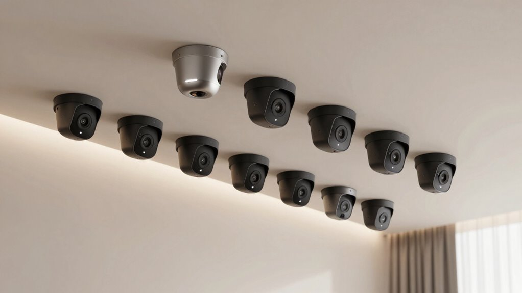 Ever wonder how well a security camera can monitor your safe room in complete darkness? The night vision range is vital here. Most indoor cameras offer a range between 10 and 30 feet, but some feature up to 50 feet, suitable for larger spaces. Longer ranges allow you to keep an eye on more area without extra lighting. The quality of night vision depends on IR LED power and sensor sensitivity, impacting clarity and color accuracy at night. Advanced technology, like full-color night vision, can provide even better visibility in low-light conditions. When choosing a camera, consider how much space you need to cover in darkness and look for models with sufficient IR range and high-quality IR LEDs to guarantee detailed, clear images around the clock.