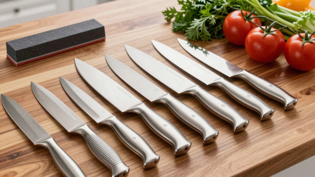 A sharp blade is essential for precise cuts and efficient kitchen work, so choosing a knife with a reliable edge is critical for culinary students. A sharp edge reduces the force needed to cut, which helps prevent food damage and makes prep work smoother. Maintaining consistent razor-sharpness is indispensable for both efficiency and safety, as dull blades require more effort and increase the risk of slipping. The blade’s hardness, measured by the Rockwell scale, determines how long it stays sharp before needing sharpening. High-quality stainless steel and high-carbon steel blades generally offer superior edge retention and sharper cutting performance. Proper sharpening and honing techniques are key to preserving blade sharpness and extending the knife’s lifespan, ensuring it remains a reliable tool throughout your culinary journey.