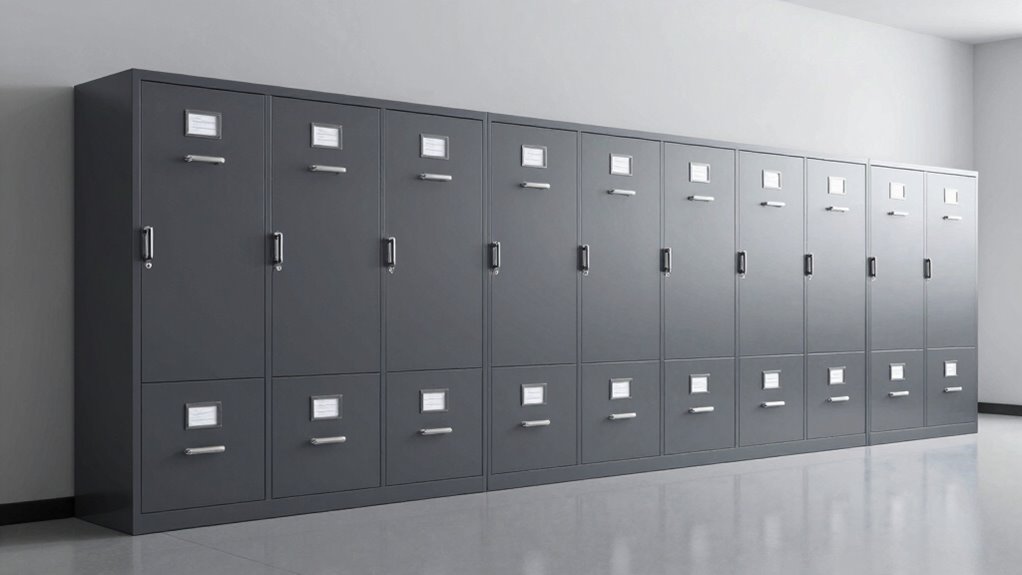 Understanding fireproof rating standards is vital because they determine how well a lateral file cabinet can protect your legal documents in a fire. These standards measure how long and at what temperature a cabinet can withstand fire exposure, often rated at durations like 1 hour at 1700°F. UL certification is a common benchmark, confirming the cabinet meets specific fire-resistance criteria. Testing typically involves high temperatures ranging from 1550°F to 2000°F, depending on the standard. Some ratings also include impact resistance tests, such as dropping the cabinet from heights, to guarantee durability during extreme conditions. The materials used, like gypsum, steel, and fire-resistant insulation, play an indispensable role in achieving these ratings and safeguarding your documents effectively during a fire emergency.