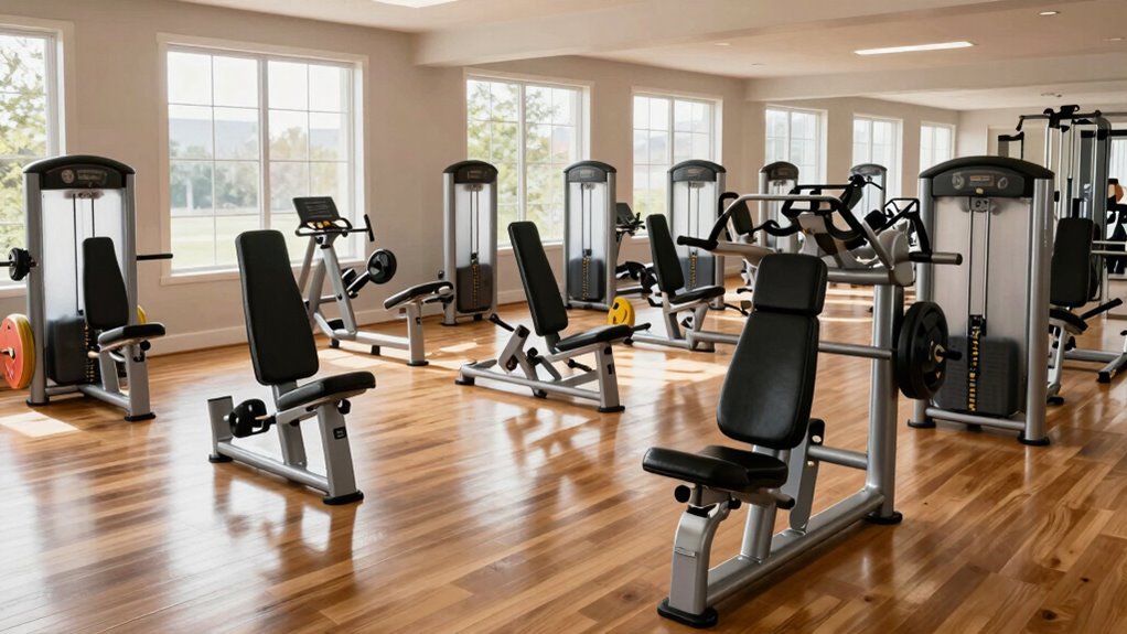 These machines typically need about 4 to 6 feet of space in length and width, depending on the model. I recommend measuring your available area beforehand to guarantee a good fit. Keep in mind that some designs are more compact, making them ideal for smaller gyms. I always suggest leaving enough room around the machine for safe and comfortable exercise, so plan accordingly to avoid clutter or accidents.