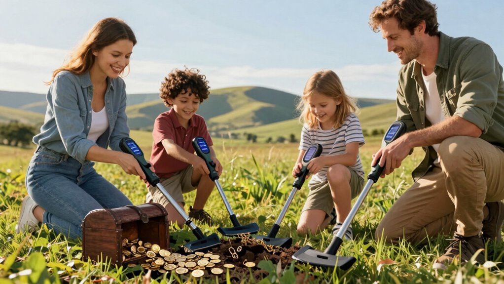 Looking for the best metal detectors for family treasure hunts in 2026? I’ve found top models that are lightweight, waterproof, and easy to operate, perfect for kids and adults. These devices feature adjustable stems, multiple detection modes, and long battery life, making outdoor adventures more fun. Whether you’re searching beaches, parks, or rocky terrains, these detectors have you covered. Keep going to discover detailed reviews and tips to choose the ideal one for your family’s treasure hunts.
