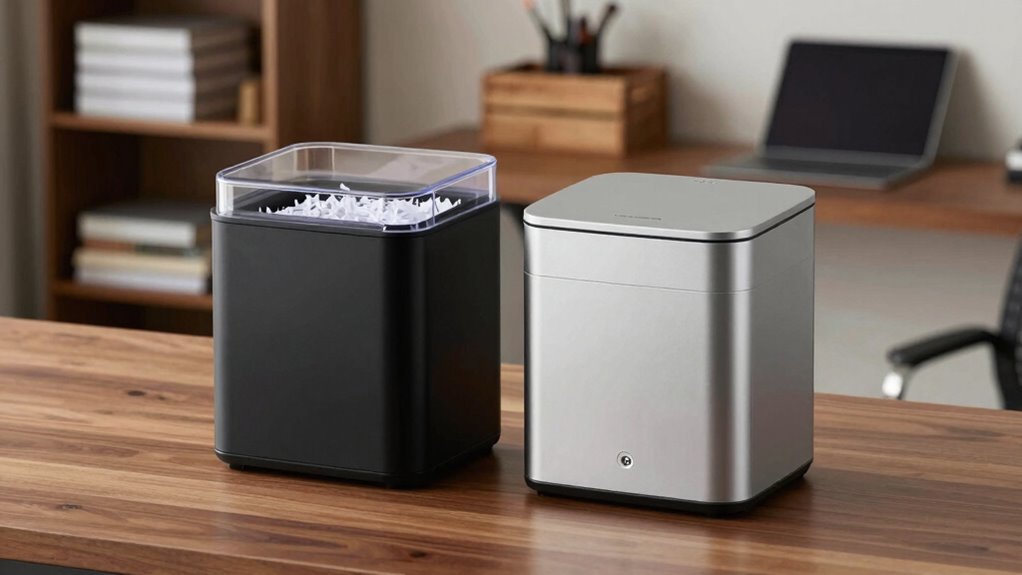 The shredded material is highly secure, breaking sensitive documents into tiny, unreadable pieces, like a puzzle with missing pieces. I’ve tested several models, and each one guarantees confidentiality by minimizing the risk of reconstruction. The micro-cut process makes it nearly impossible for anyone to piece together your information. So, you can trust these shreds to protect your privacy, giving you peace of mind in your home office.