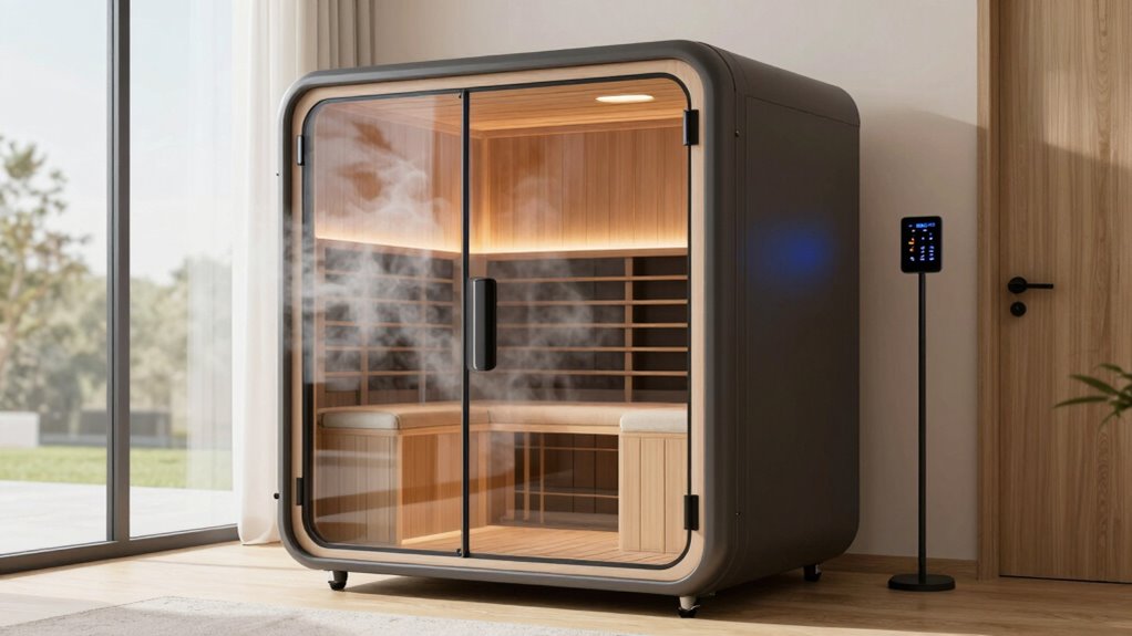 Heating speed and power considerably influence how quickly your portable steam sauna heats up and how consistently it maintains the desired temperature. Faster heating speeds mean you can enjoy your session sooner, often within 5 to 10 minutes. Higher wattage steam generators, like 1200W or more, produce steam more rapidly and keep it steady, ensuring a reliable experience. Powerful models reach ideal temperatures faster than lower-powered options, saving you time. Some saunas feature multiple steamers or dual heating systems, which further reduce wait times and promote even heat distribution. Efficient heating technology not only shortens preheat time but also helps maintain a stable temperature throughout your session, maximizing comfort and health benefits. Prioritizing heating speed and power ensures a more effective and enjoyable sauna experience.
