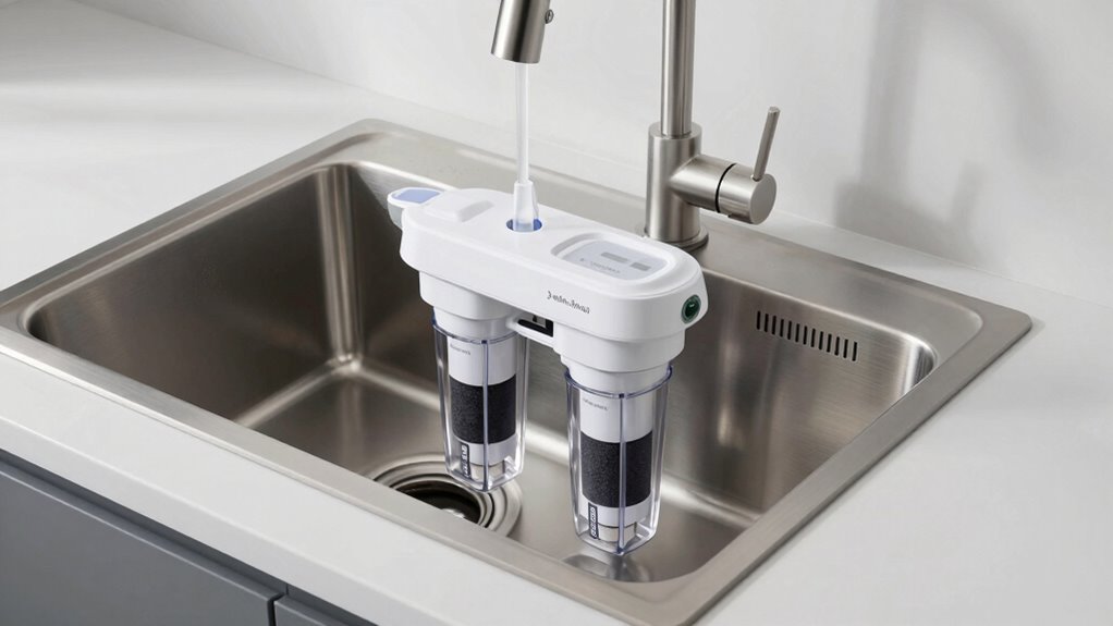 Under-sink RO systems are perfect for well water, but with a catch—they often need pre-treatment to handle impurities like iron or sediment. While they’re effective at removing contaminants, I recommend installing a pre-filter to extend their lifespan and guarantee the water’s purity. It’s like giving your system the tools it needs to do its job well. Proper maintenance makes all the difference for well water filtration.