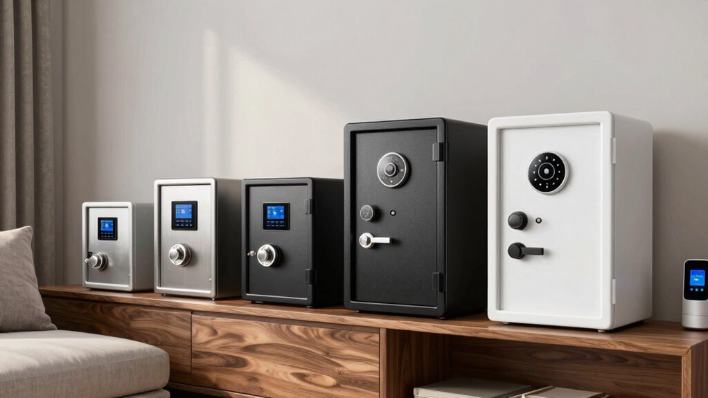 Choosing the right safe size hinges on accurately evaluating how much you need to store. I recommend examining your valuables and important documents to determine the capacity required. Larger safes provide more space but can be less discreet and may need secure mounting, which isn’t ideal for shared homes. Consider whether you need removable shelves or compartments to keep items organized and easily accessible. Pay close attention to the safe’s internal dimensions to ensure your largest valuables fit comfortably. Striking a balance between sufficient capacity and ease of installation is key, especially in shared living environments where space and discretion matter. A safe that’s too small won’t meet your needs, but one that’s too large might be cumbersome and less discreet. Find that middle ground for ideal security and convenience.