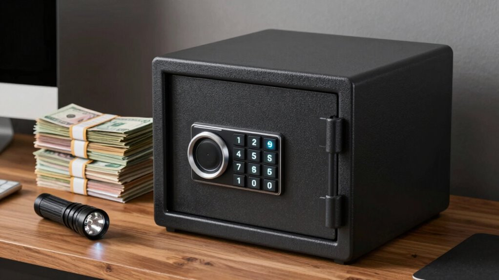 Choosing the right safe for your emergency cash stash hinges on understanding its security features. These features are essential for preventing unauthorized access and protecting your cash during emergencies. Combination locks, key locks, or digital locks add layers of security, making forced entry difficult. Fireproof and waterproof properties provide critical protection against environmental damage, ensuring your cash stays intact. Discreet design elements, like camouflage or hidden compartments, help keep the safe out of sight from potential thieves. Tamper-evident features, such as sealable locks or alarms, alert you to any unauthorized attempts. Ultimately, a sturdy construction with reinforced steel or high-quality composites ensures the safe resists physical attacks. Prioritizing these security features helps safeguard your emergency cash effectively.