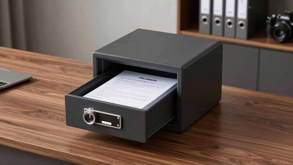 When choosing the right safe for your estate planning files, I believe it’s best to think of it as a gentle guardian—protecting your most precious documents without drawing unnecessary attention. By selecting a reliable, secure option, you’re ensuring your legacy stays safe and sound, even when life throws a curveball. After all, a little foresight now can bring peace of mind in the future, letting you rest easy knowing everything’s kept in good hands.