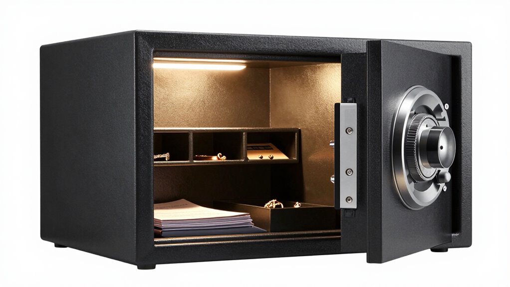 Imagine opening your safe and instantly illuminating your treasures with a gentle, flickering glow. With the right interior motion lighting, I felt like I had my own secret vault, illuminated just for me. These safes with smart lighting make finding what you need quick and easy, even in the dark. Trust me, once you experience that seamless glow, you’ll never want to settle for anything less—your valuables deserve this touch of brilliance.