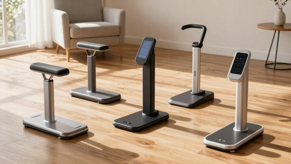 Choosing a sit-to-stand lift assist device starts with guaranteeing its weight capacity matches or exceeds your body weight. It’s essential to select a lift that supports at least 60-70% of your weight for safe, effective transfers. Be sure to verify that the device can handle any additional equipment or accessories used during transfers. It’s wise to choose a lift with a capacity that considers future needs, such as weight gain or accommodating other users. Exceeding the device’s weight limit can compromise its stability and safety features, increasing the risk of accidents. Always double-check the maximum weight capacity before purchasing or using a lift. Prioritizing proper weight capacity ensures safety, comfort, and peace of mind during daily transfers at home.