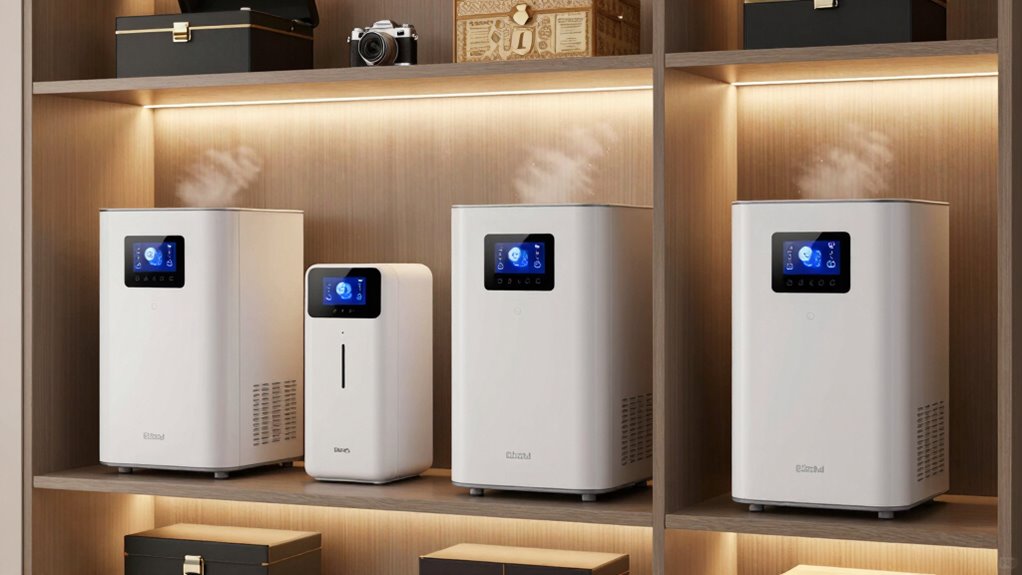 Choosing the right smart dehumidifier is key to protecting your valuables from moisture damage. With options ranging from compact desiccants to advanced WiFi models, there’s something for every need. Have you considered which features matter most to you—like portability, capacity, or smart connectivity? Investing in the right device guarantees your treasures stay dry and safe for years to come. After all, isn’t safeguarding what matters most worth a little extra effort?