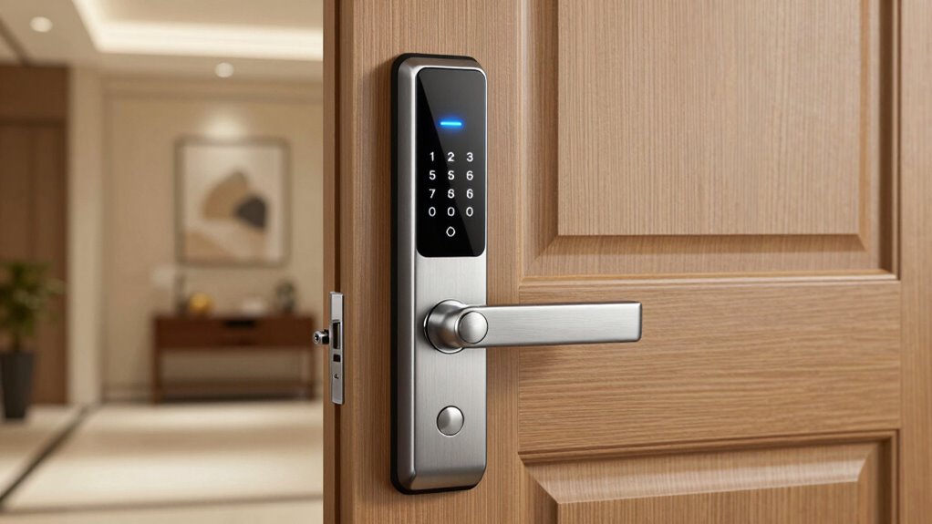 Choosing the right smart lock with fingerprint and keypad is like finding the perfect key in a digital age—trust me, I’ve been there. These models blend security and convenience, making your home feel as secure as the Tower of London, yet as accessible as a modern cafe. Remember, whether you prefer app control or biometric access, there’s a smart lock out there that fits your needs. Stay ahead of the curve and lock in peace of mind.