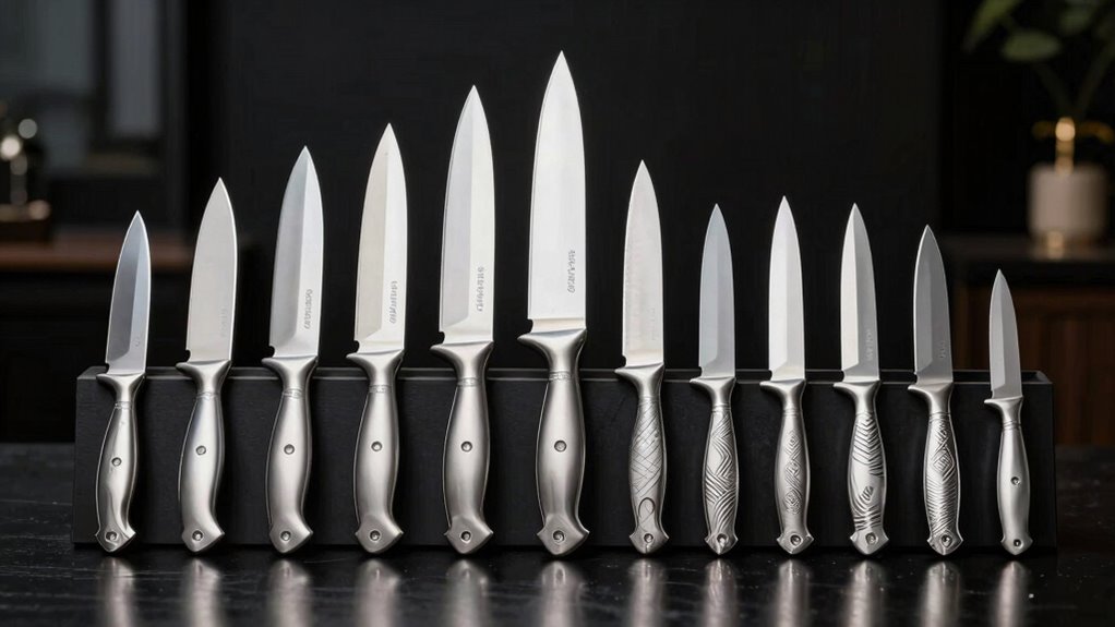 Stainless steel knives resist corrosion through a clever combination of corrosion-resistant chromium and protective coatings. I always guarantee I dry my knives thoroughly after washing, which helps prevent moisture from causing rust. Regularly honing and avoiding harsh abrasives also keep my blades beautiful and blemish-free. By practicing proper care—cleaning, drying, and storing—I extend their elegance and efficacy, ensuring my knives stay corrosion-free and ready for any culinary challenge.