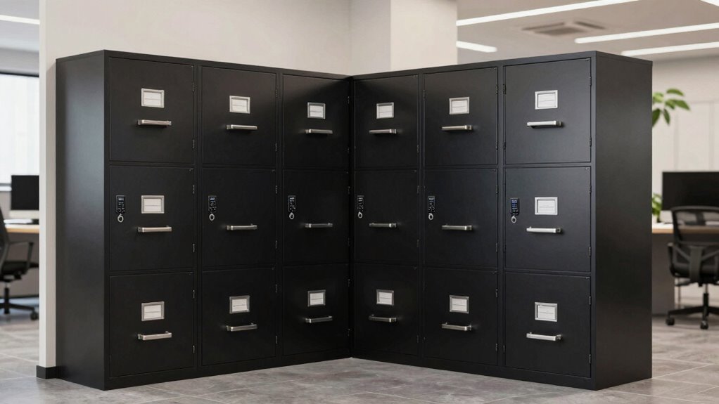 Water resistance is a critical factor to take into account because fires often come with water-related hazards like flooding or sprinkler damage. The water resistance levels in fireproof file cabinets are usually rated by how long they can withstand immersion, such as 24 or 48 hours. A higher rating means better protection against water exposure during emergencies involving flooding or pipe bursts. Many water-resistant fireproof cabinets feature sealed or gasketed doors to prevent water from seeping in. The testing process involves submerging the safe in water for a specified period, which is reflected in its rating. It’s essential to verify the water resistance level to match your environment’s specific water-related risks, ensuring your documents stay safe even in unexpected water incidents.